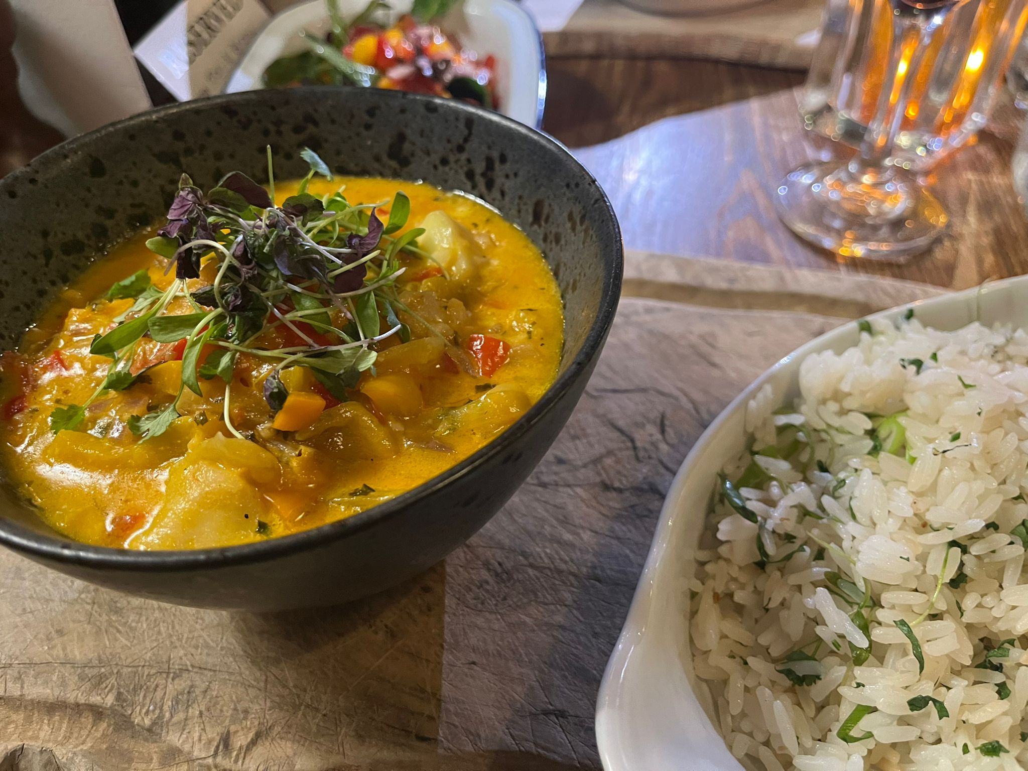 For the main course, I opted for the “Moqueca,” a cod dish cooked in a creamy coconut milk with peppers, tomatoes, and authentic Oleo de Dende (a staple in Brazilian kitchens). Packed with an incredible amount of fish and served with fluffy rice, it was a vibrant and delicious explosion. My companion, Briony, went for the “bobo de camarao,” king prawns in an exotic and rich cassava cream, served with coriander rice and a green salad. The sheer volume of succulent prawns and the vibrant flavour were truly impressive.