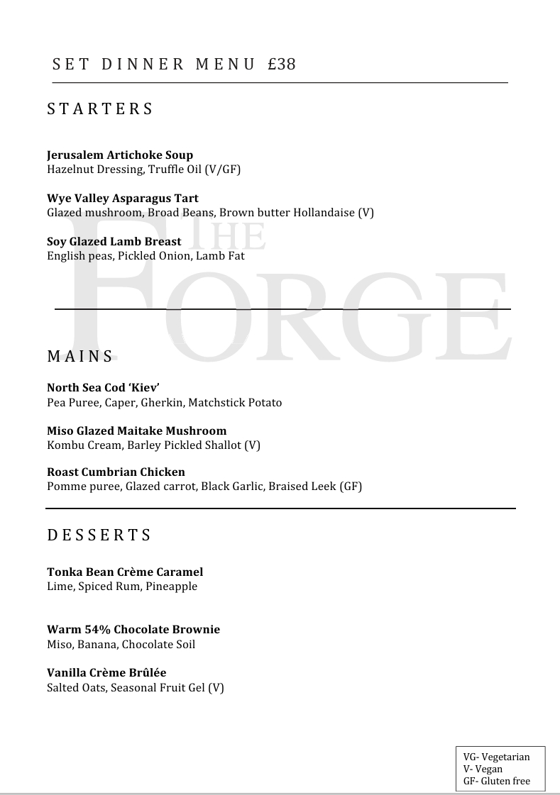 Join us at The Forge for a freshly prepared delicious candle-lit evening meal from our set dinner menu.