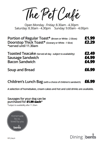 The Pet Café is the perfect place to take time out with your four legged friends. Serving a selection of light breakfast items until 11am, freshly prepared sandwiches and salads as well as homebakes, patisseries and hot and cold drinks. Loved by walkers, families and our furry friends.