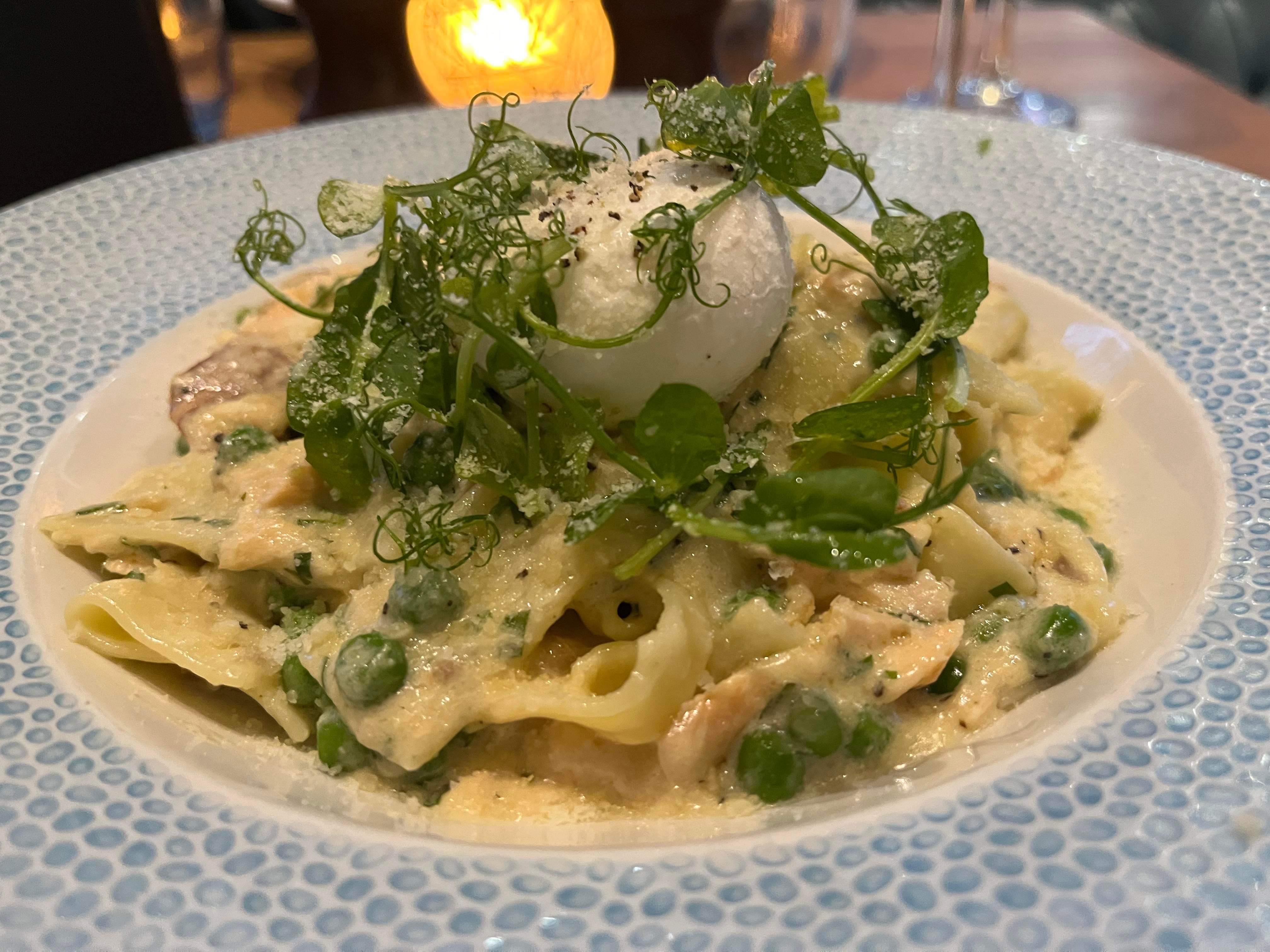 Tori went for the HOME SMOKED SALMON PAPPARDELLE with a creamy white wine sauce, fresh tarragon, and sweet garden peas. Topped with a soft poached egg. The presentation of this dish was beautiful, and really exemplified a summer menu. Powerful flavour but very well-balanced dish. Alongside our mains we went for a lovely bottle of wine recommended by Chris, given we were both having fish and pasta. It was a perfect accompaniment, very light and refreshing we can certainly recommend.