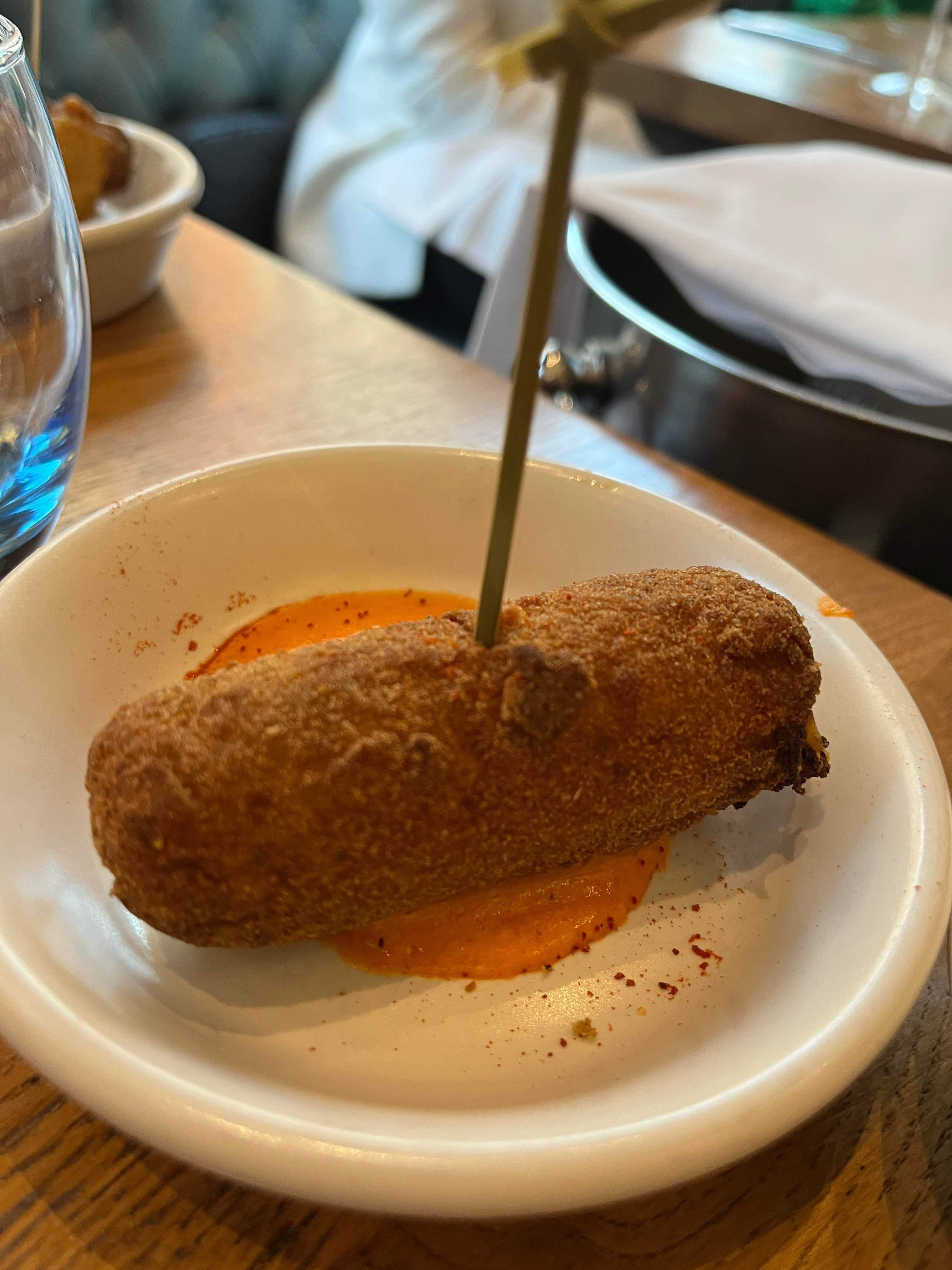 Despite our well-intentioned plan with the pinchos, we did not have any room for dessert, but since our visit we have heard great reviews about the Tiramisu. We instead opted for a drink from the something sweet menu. The COCOA & CHERRY SMOKED MANHATTAN, is not just a show stopper in terms of presentation this was exactly what I wanted at the end of a rich meal, made from Woodford Reserve, cherry brandy, blue curaçao and cherry syrup smoked in a cloche with apple wood chips, I cannot recommend this drink highly enough for any whiskey fans. Tori finishes with an ANDALUSIAN SKYLINE, another delicious cocktail showcasing another wonderful local gin Kingdom Recommends Lychee Gin, blue Curaçao, lemon juice, apple juice and aquafaba. This drink screams cocktail by the beach and perfect sweet finish to a meal.