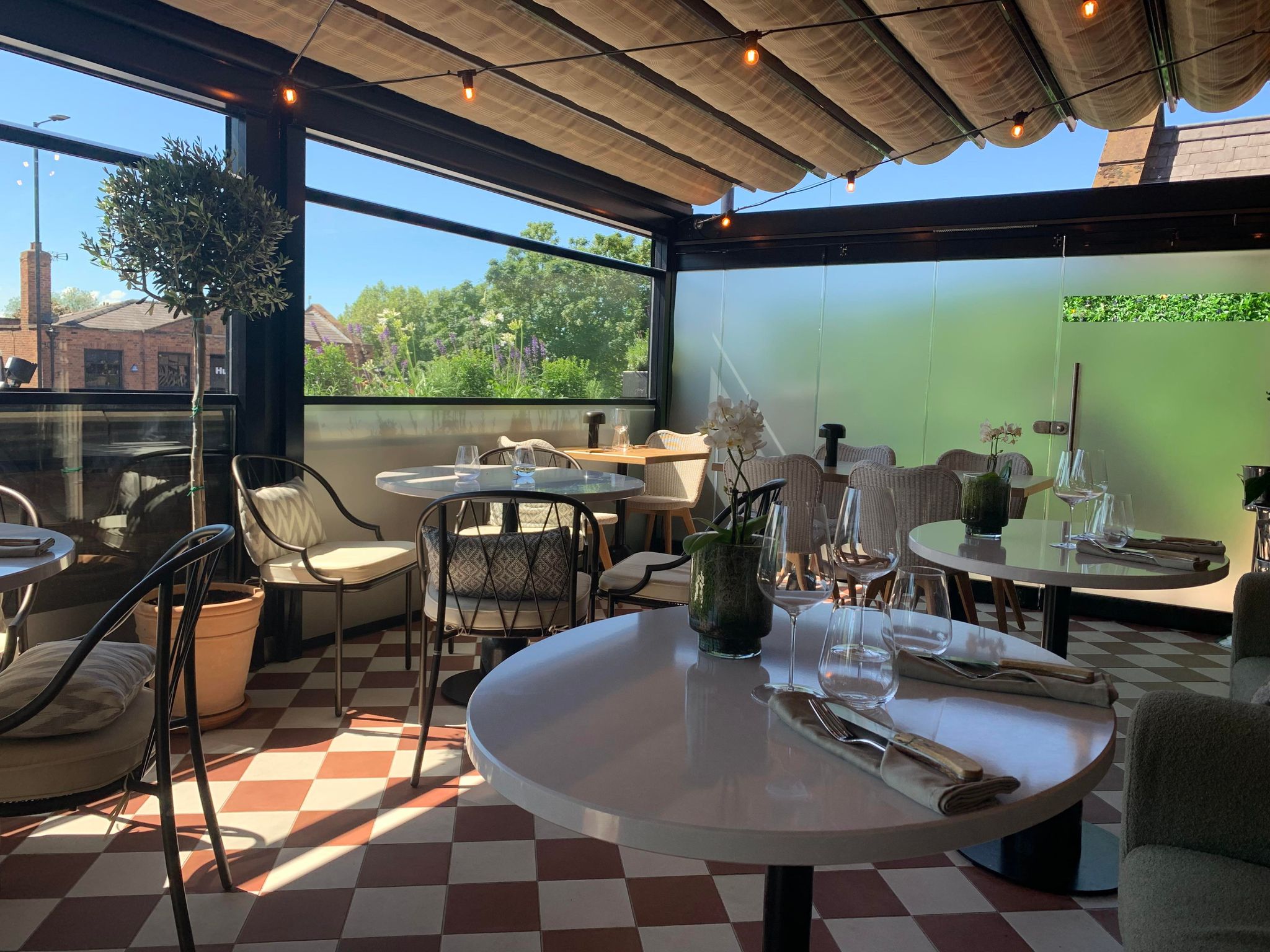 Other details include the use of love seats rather than individual chairs to allow both guests to face the view rather than one being forced to stair at the wall. The green tones and botanical notes are bang on trend and as you would expect from this venue, all the elements of lighting, table ware and cutlery have been well thought out to match the surroundings.