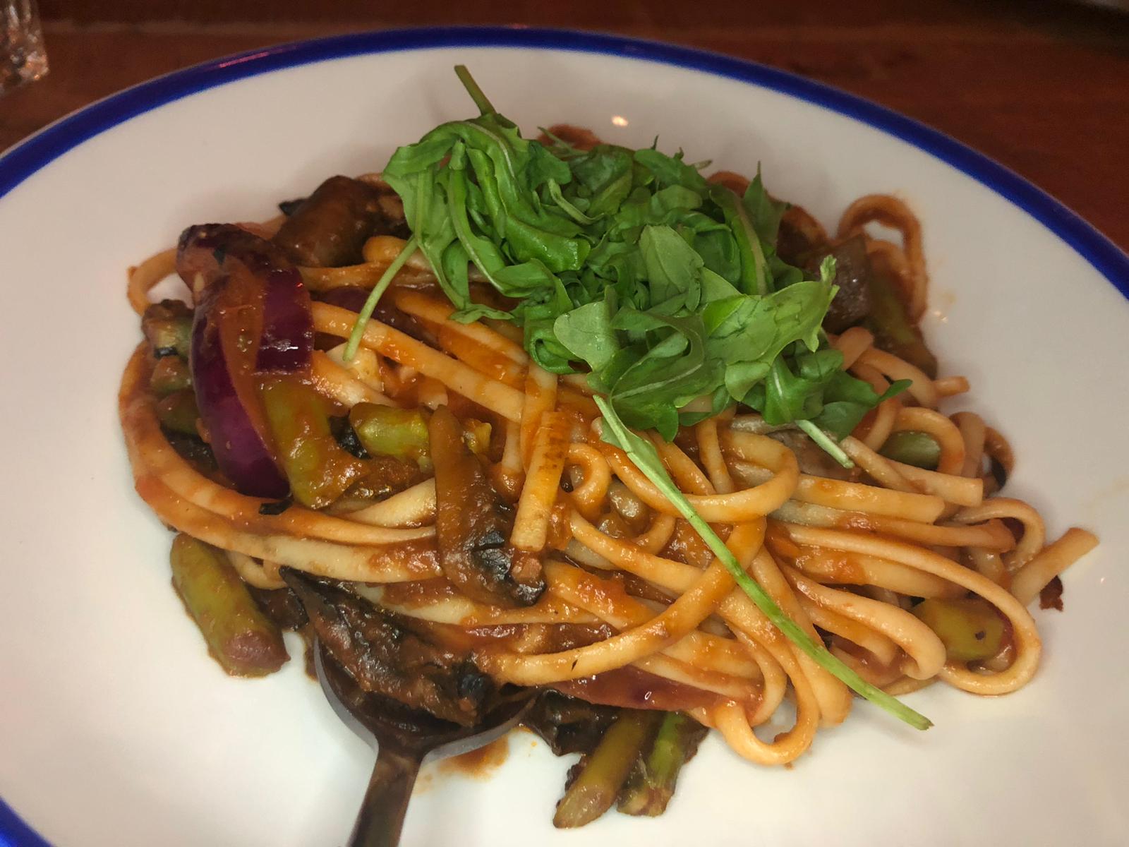 Briony went for something slightly different, a rich portobello mushroom, asparagus, red onion, garlic and tomato linguine, The tomato sauce was unctuous with a slight sweetness and loaded with the yummy vegetables.