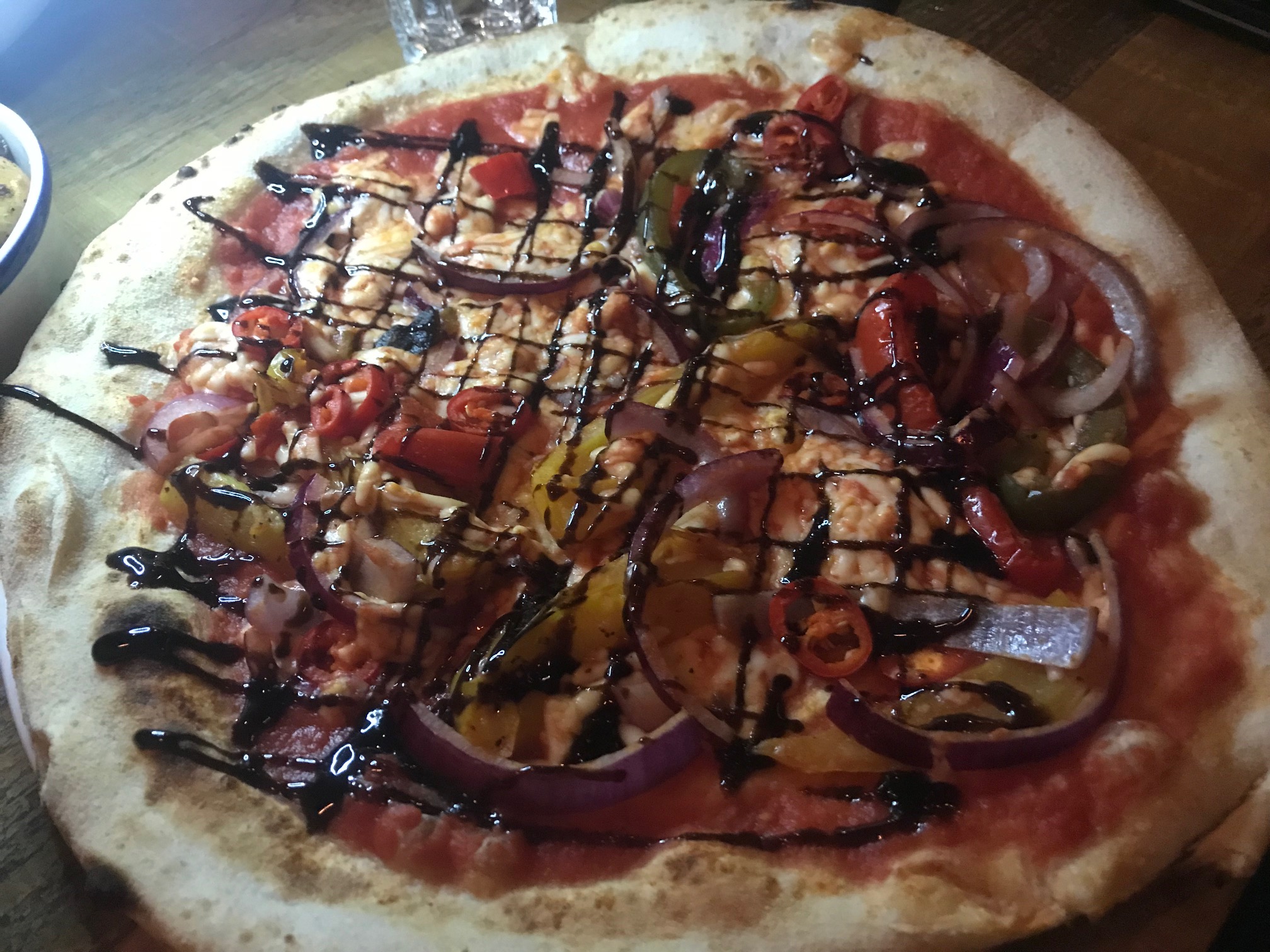 Carla opted for the Roasted Pepper, chilli, Red Onion, Tomato, Vegan Mozzarella pizza with Balsamic dressing. When this arrived I did a double take as I could not believe that the pizza in front of her was actually vegan, it looked, smelled and tasted amazing and I definitely *had* to steal a slice!